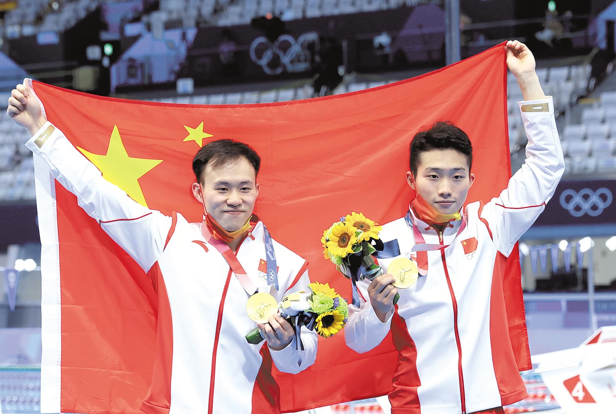 7月28日,中国选手王宗源(右)/谢思埸在颁奖仪式后。 当日,在东京奥运会男子双人三米跳板决赛中,中国选手王宗源/谢思埸获得冠军。 (新华社发)