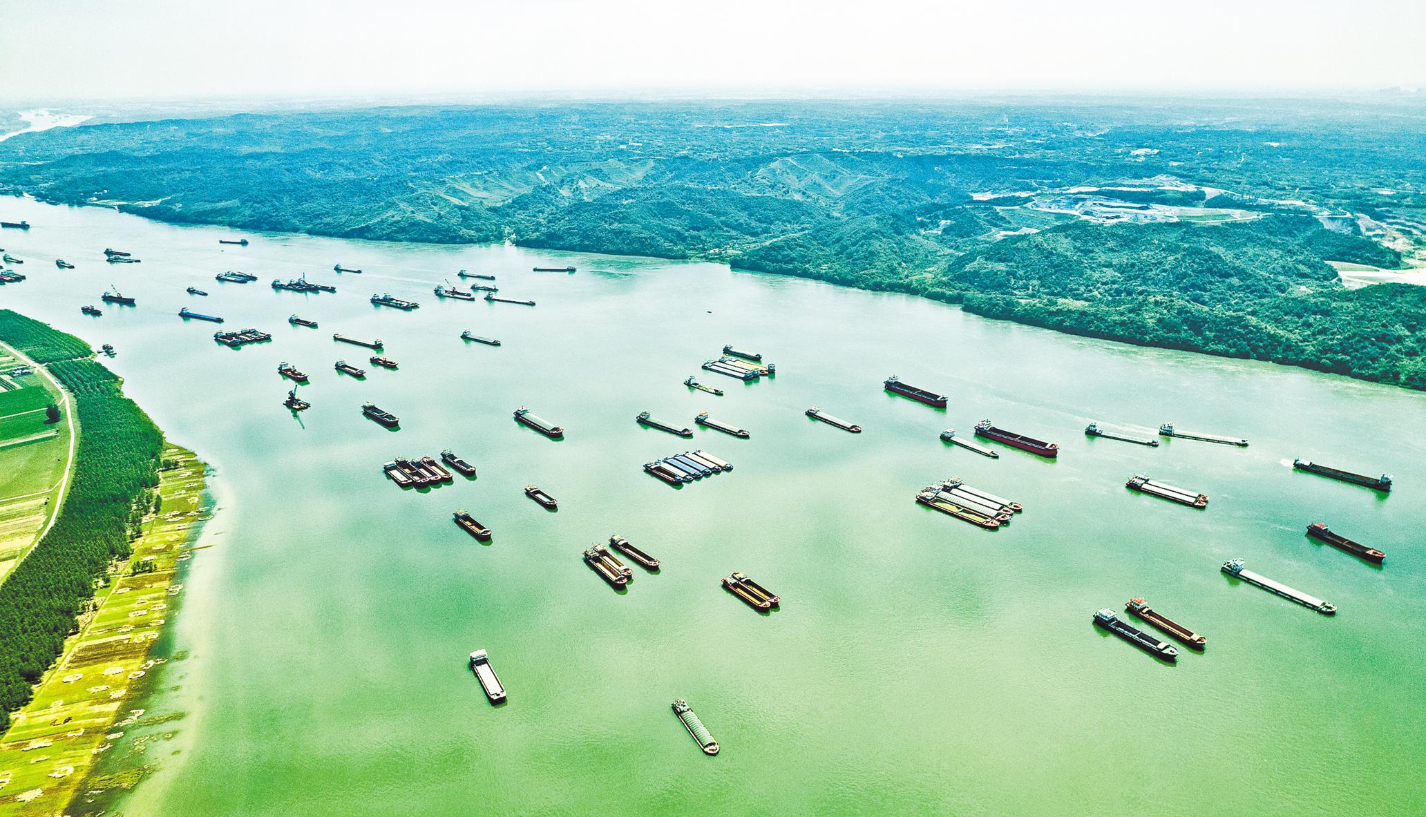 5月16日8时,长江枝江顾家店江段锚地,大型运输驳船蓄势待发。目前,三峡水库开始腾库放水迎洪,葛洲坝下泄流量加大,5000吨级船舶可直达宜昌装卸货物,长江中游流域商品运输成本进一步降低。(刘曙松 黄路遥 摄)