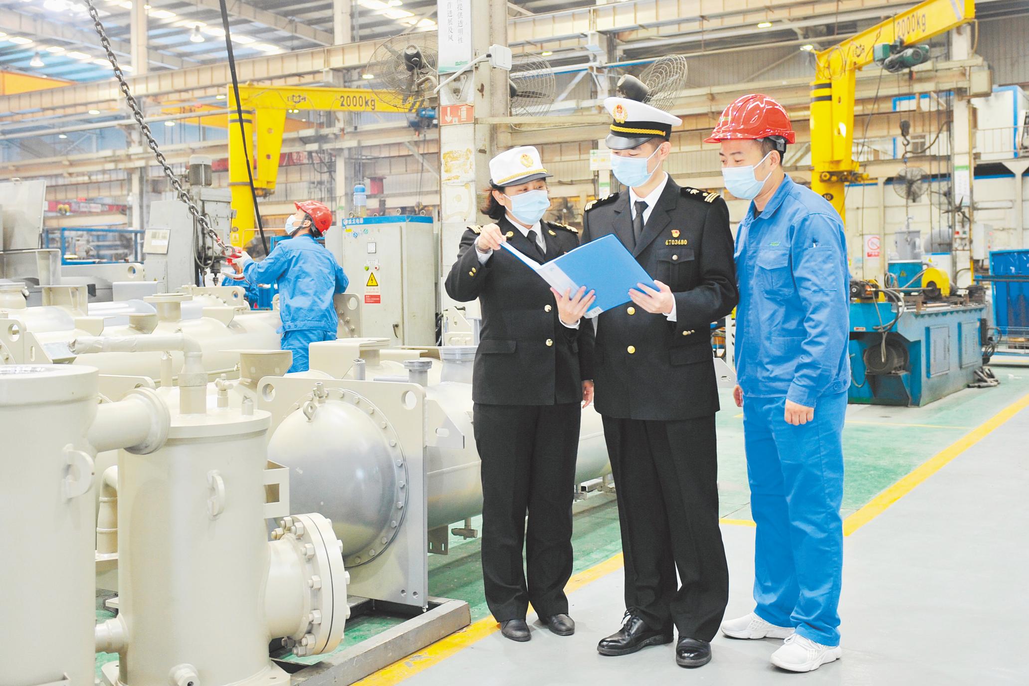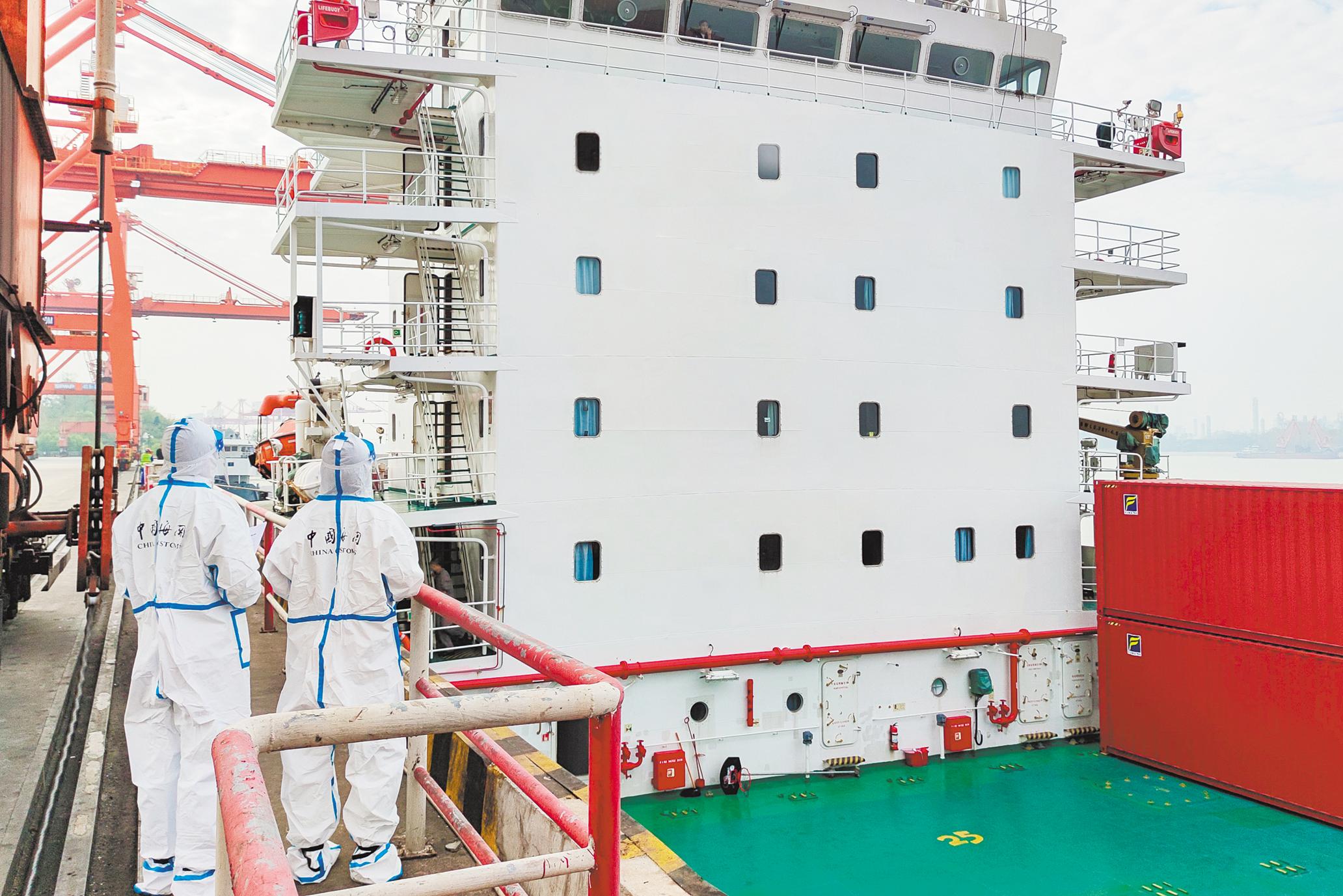 武汉海关关员对出境江海直航船舶进行现场监管。 (武关宣 摄)