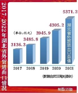 2017年湖北进出口首超3000亿元。2020年,尽管湖北遭遇新冠肺炎疫情严重冲击,外贸仍持续向好,成功迈进4000亿元台阶。2021年,湖北进出口总值突破5000亿元,达5371.2亿元,创同期历史新高。从2017年的3136.3亿元,到2021年的5371.2亿元,5年净增量接近2013年外贸总值。