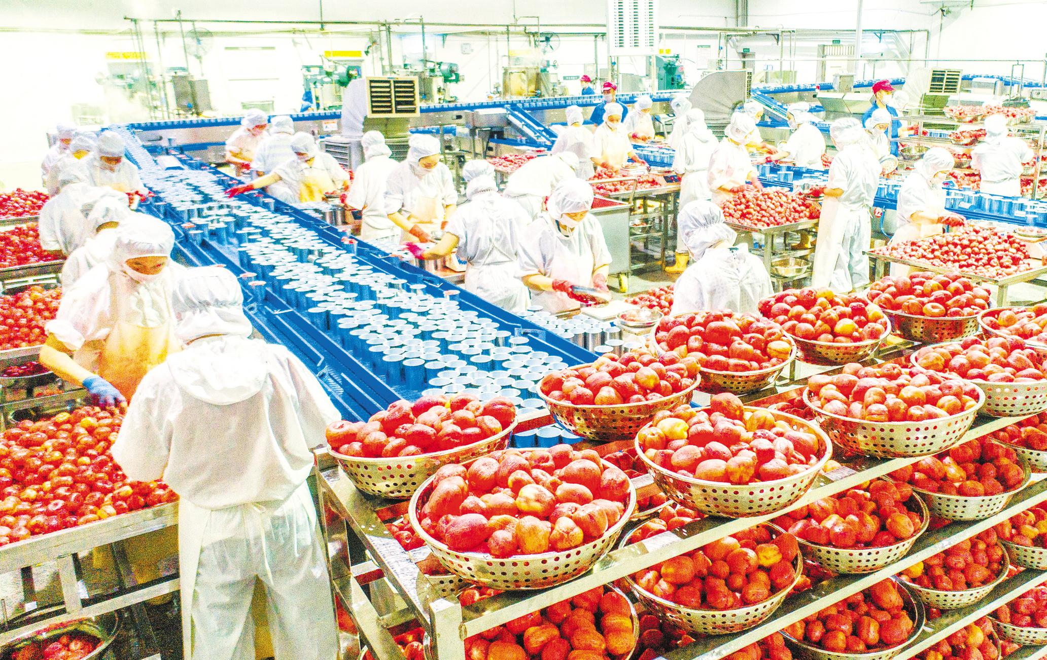秭归屈姑国际农业集团员工在果蔬自动化加工生产线上加工番茄罐头。(王罡 摄)