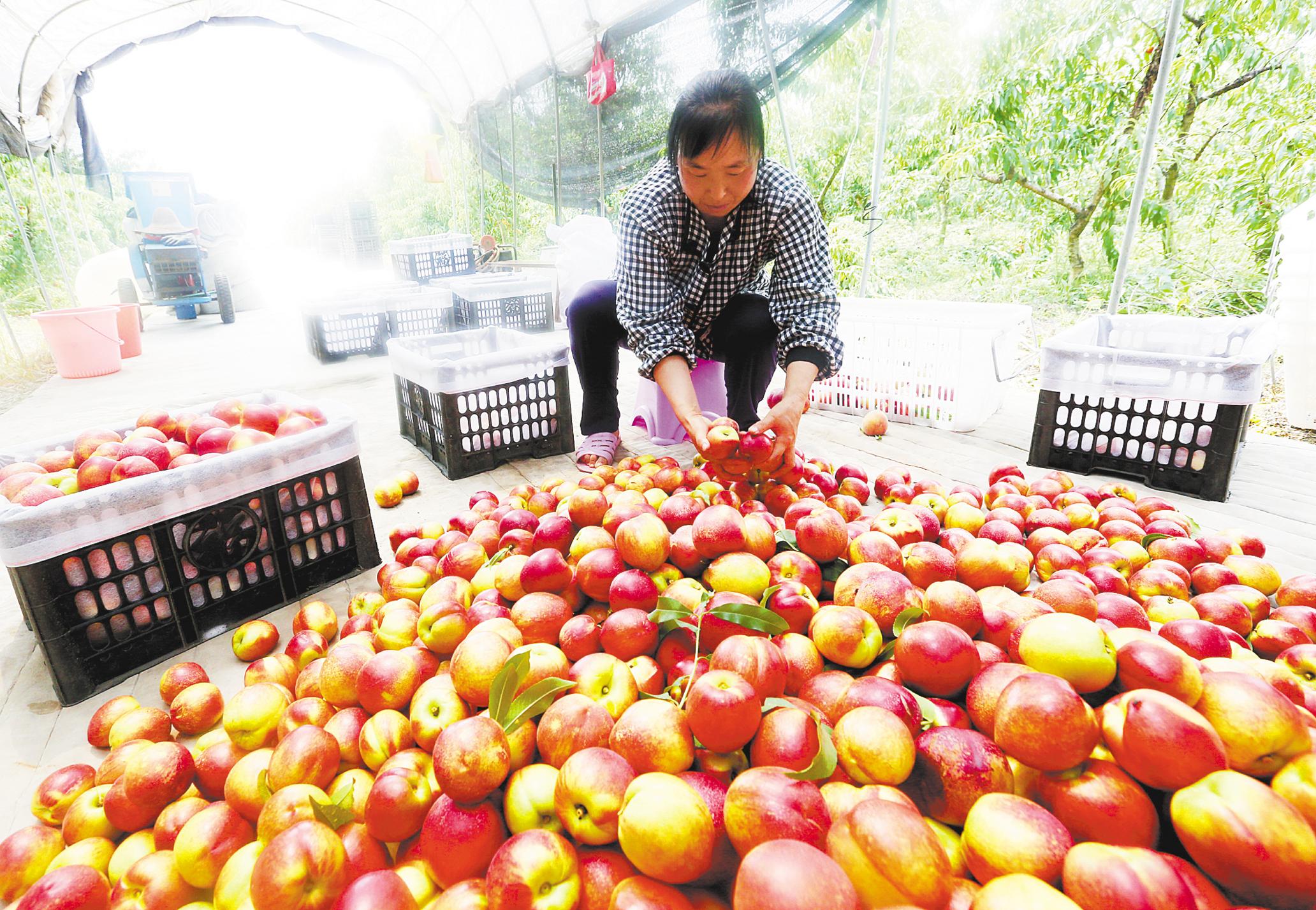 6月10 日,武汉市蔡甸区张湾街道新民村民喜摘油桃。该区10个乡村街道以“一村一品”的方式发展水果产业,并组织合作社统一外销,帮助村民增收致富。(张鸿 孙克亮 摄)
