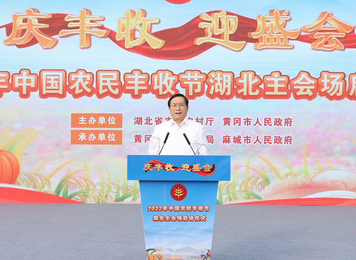9月23日,2022年中国农民丰收节湖北主会场活动在黄冈麻城市启动。省委副书记、省长王忠林宣布活动启动,并为“2022 年全省十佳农民”颁奖。他强调,要深入学习贯彻习近平总书记关于“三农”工作的重要论述,落实省委工作要求,始终胸怀粮食安全这个“国之大者”,切实扛牢农业大省的政治责任,确保粮食稳产丰产,加快农业产业化,推动实现农村更富裕、生活更幸福、乡村更美丽。