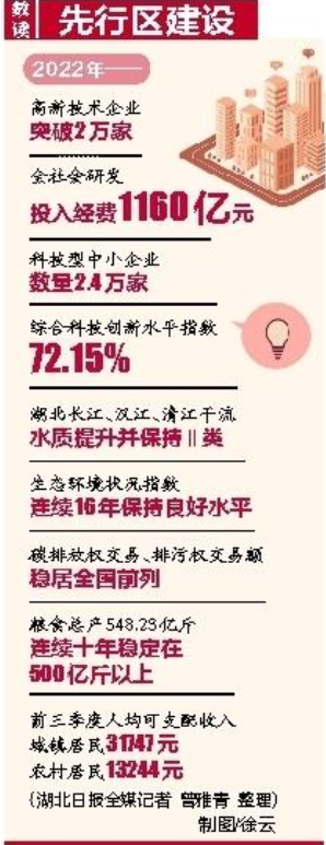 把创新摆在更加突出的位置。2022年,高新技术企业突破2万家,全社会研发投入经费1160亿元,综合科技创新水平指数72.15%。全力建设武汉具有全国影响力的科技创新中心。加快建设科技强省,9家湖北实验室、6个重大科技基础设施、2个国家技术创新中心等重大科创平台加快建设。