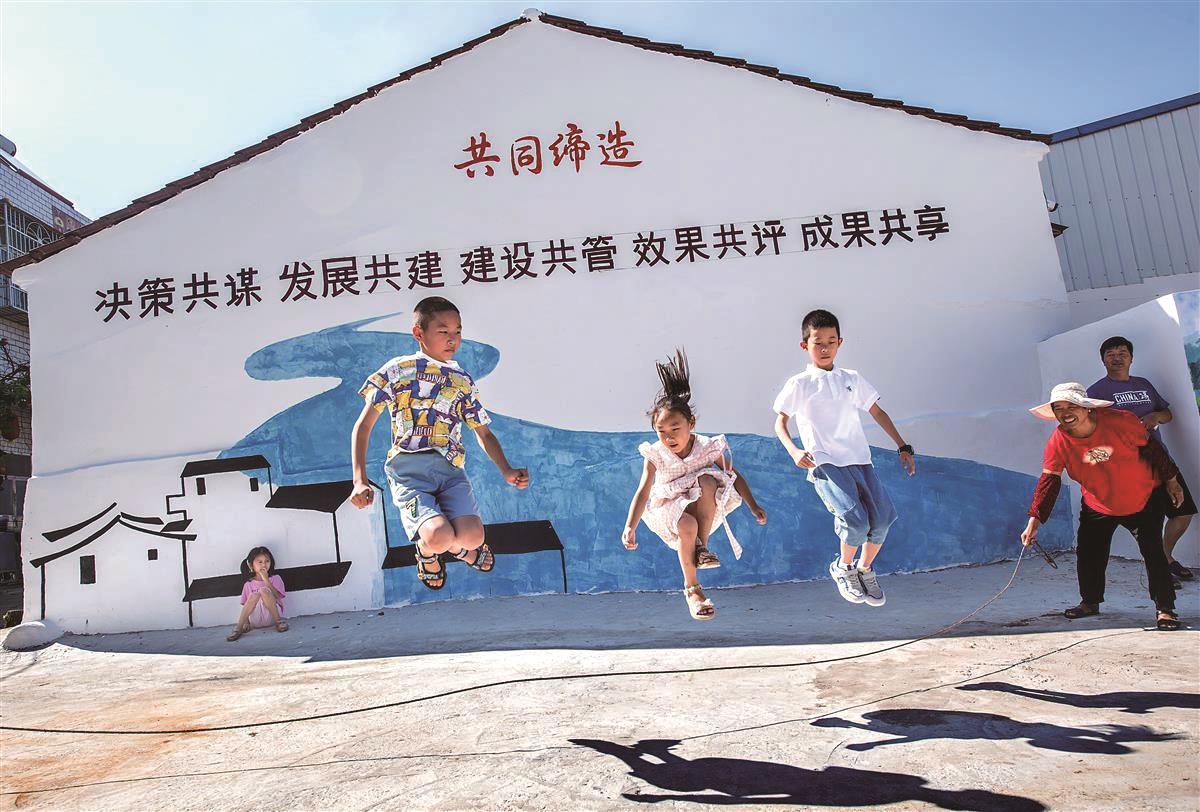 红安县似马山社区軃背树塆,村民和孩子们在村口小广场上跳绳。 (朱熙勇 摄)