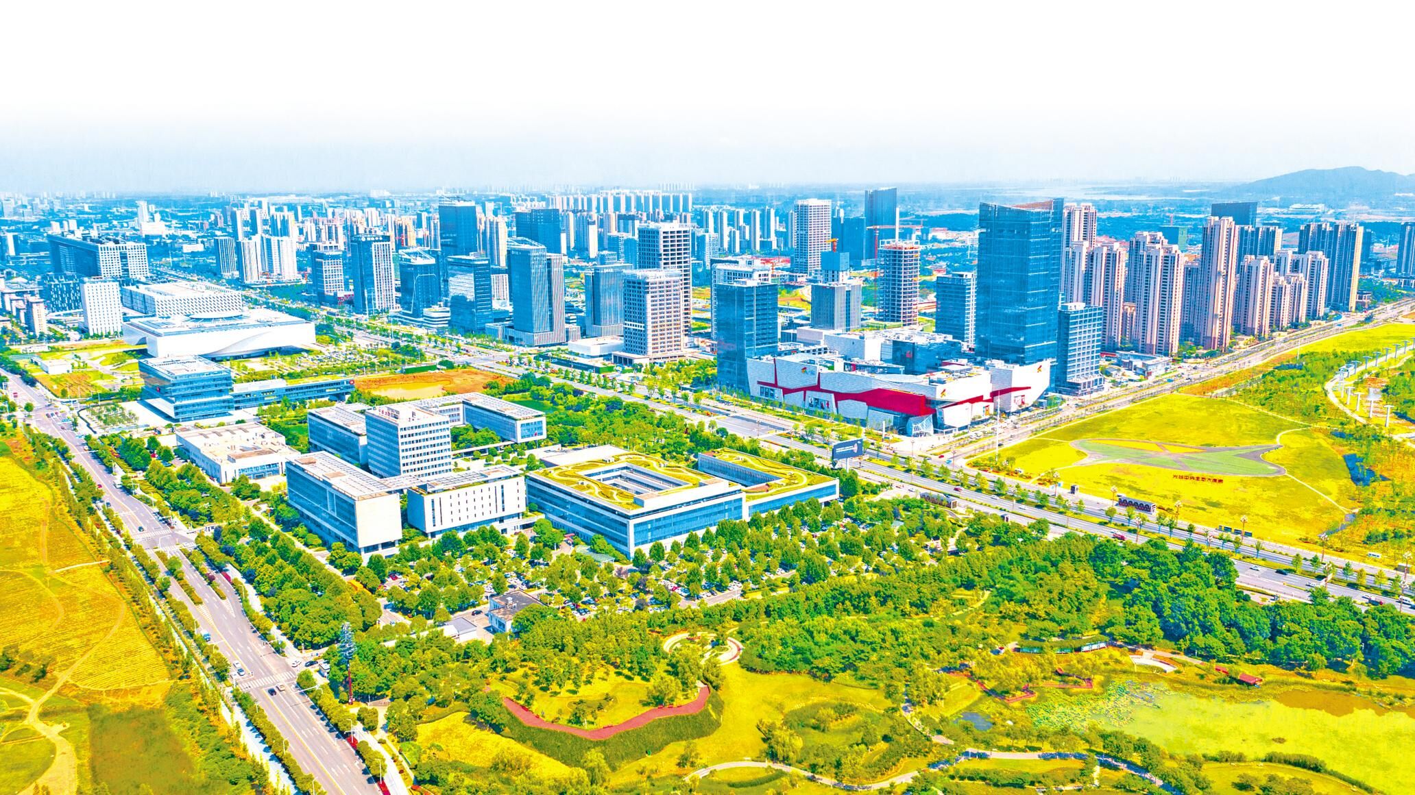 图为航拍武汉东湖高新区高新大道科创大走廊和光谷中央生态大走廊交会。(魏铼 摄)