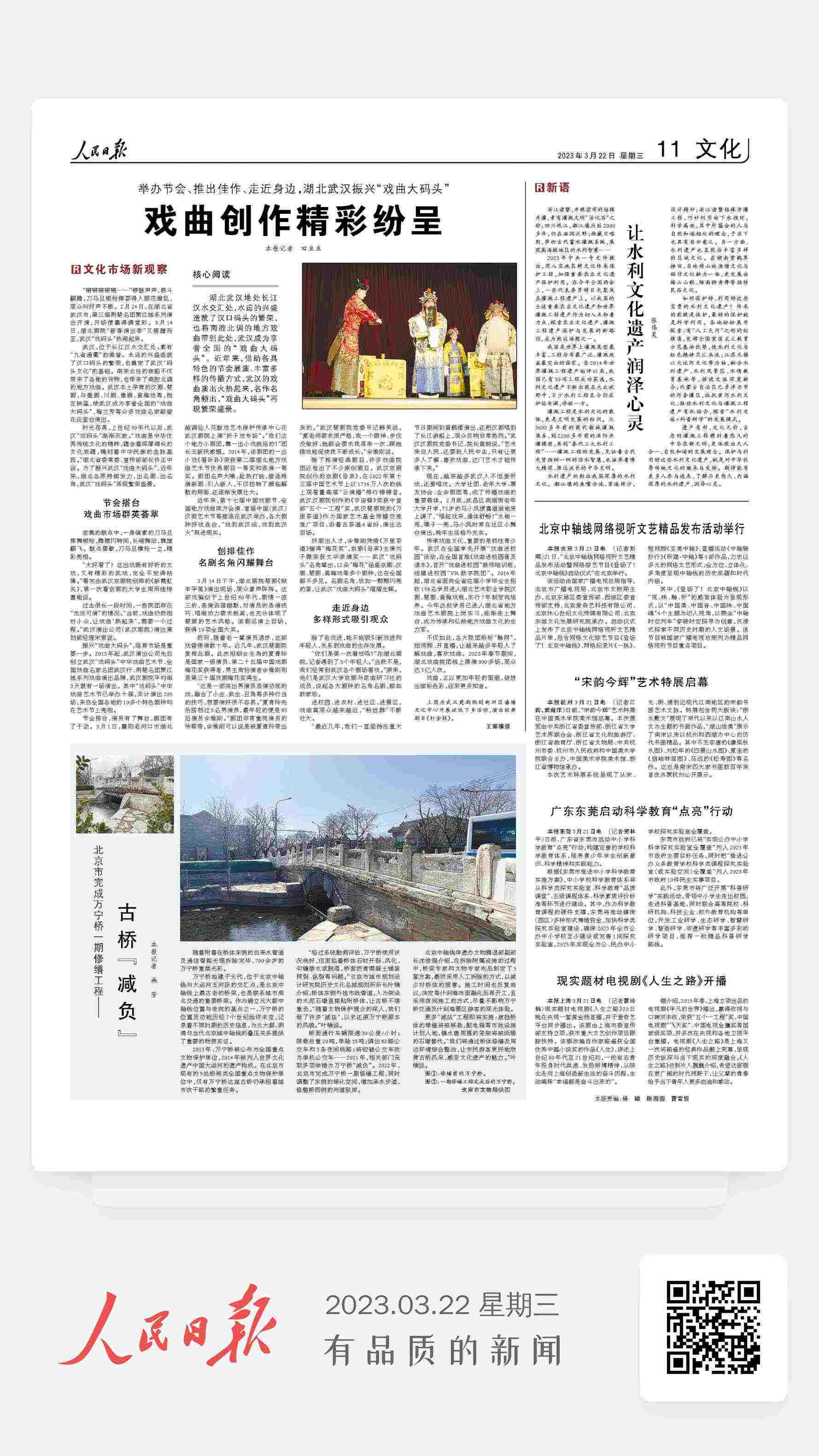 不仅如此,各大院团纷纷“触网”,拍视频、开直播,让越来越多年轻人了解戏曲,喜欢戏曲。2023年春节期间,湖北戏曲院团线上展演300多场,观众达3亿人次。