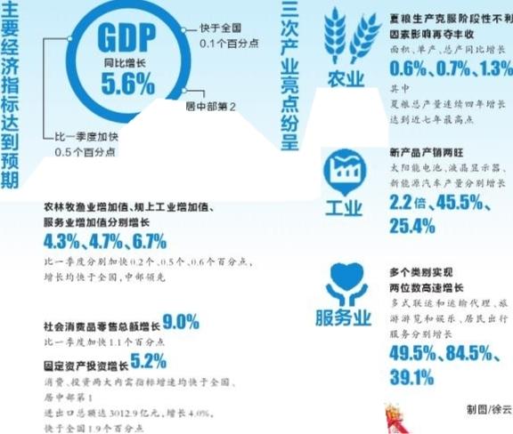 GDP同比增长5.6%,比一季度加快0.5个百分点,快于全国0.1个百分点,居中部第二;农林牧渔业增加值、规上工业增加值、服务业增加值分别增长4.3%、4.7%、6.7%,比一季度分别加快0.2个、0.5个、0.6个百分点,增长均快于全国,中部领先;社会消费品零售总额增长9.0%,比一季度加快1.1个百分点,固定资产投资增长5.2%。消费、投资两大内需指标增速均快于全国、居中部第一;进出口总额达3012.9亿元,增长4.0%,快于全国1.9个百分点。