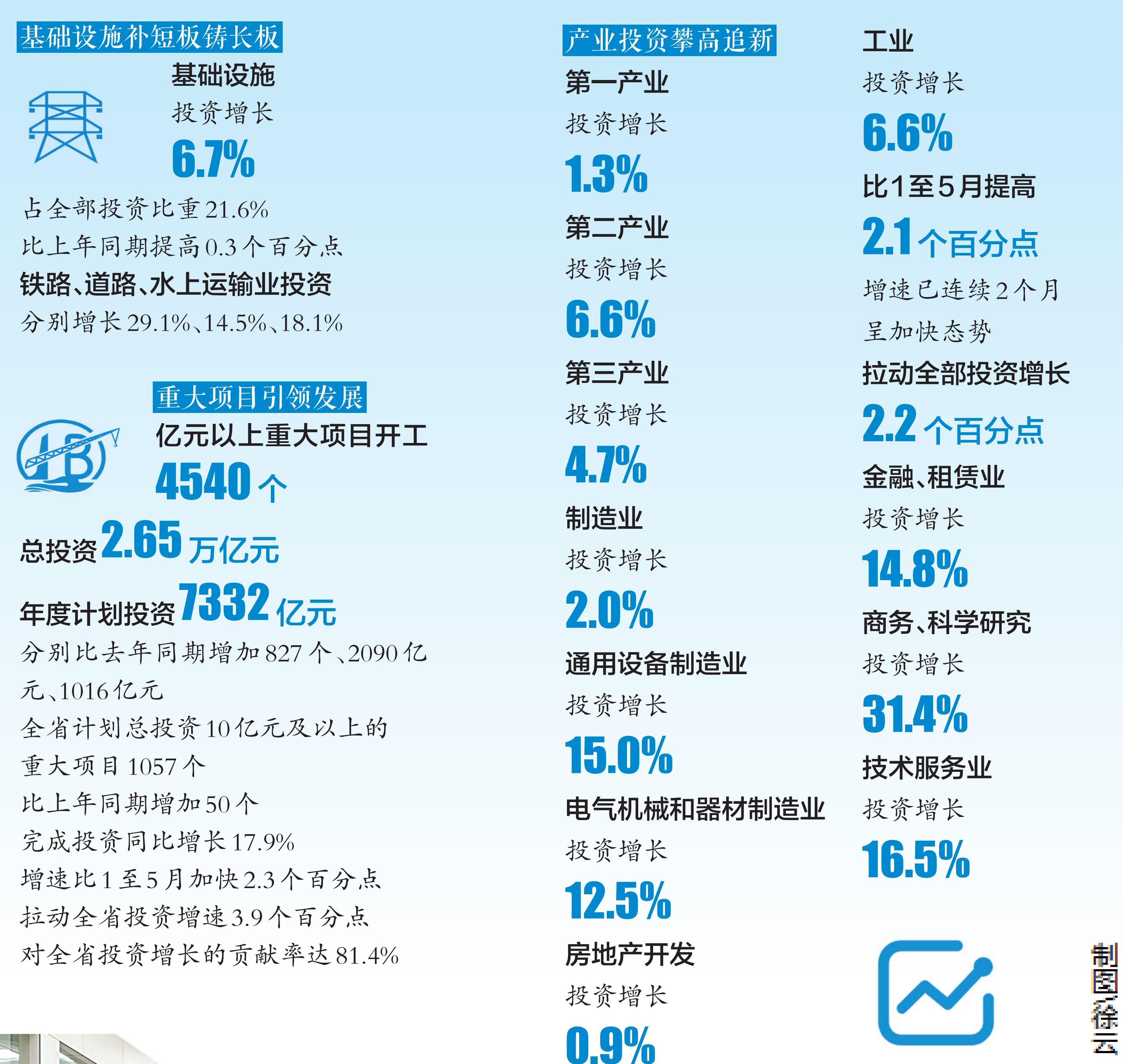 能源、交通、通信等基础设施加快建设,让“驾辕之马”奔跑有力。1至6月,我省基础设施投资增长6.7%,增速比1至5月提高0.1个百分点,占全部投资比重21.6%,拉动全部投资增长1.4个百分点。