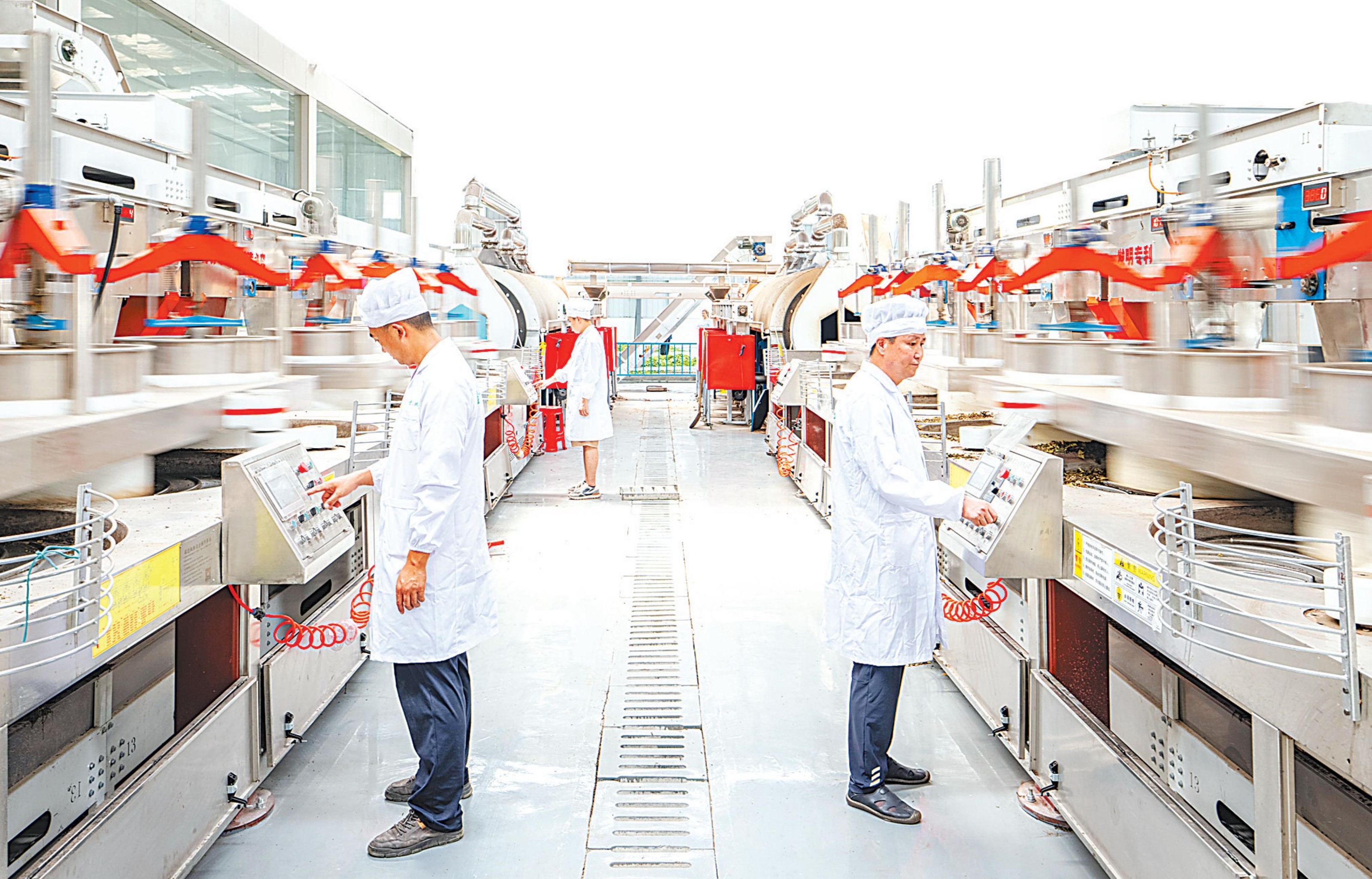 7月24日,湖北金雷茶业股份有限公司,工人在自动化生产线上忙碌。作为省级农业产业化重点龙头企业,该公司投资近亿元,新建全自动茶叶初制生产线、精制车间等,5名工人即可实现日产干茶3万斤。近年来,英山县真金白银重奖产业龙头企业,加速推进茶产业智能化升级。(薛婷、吴滕钰 摄)