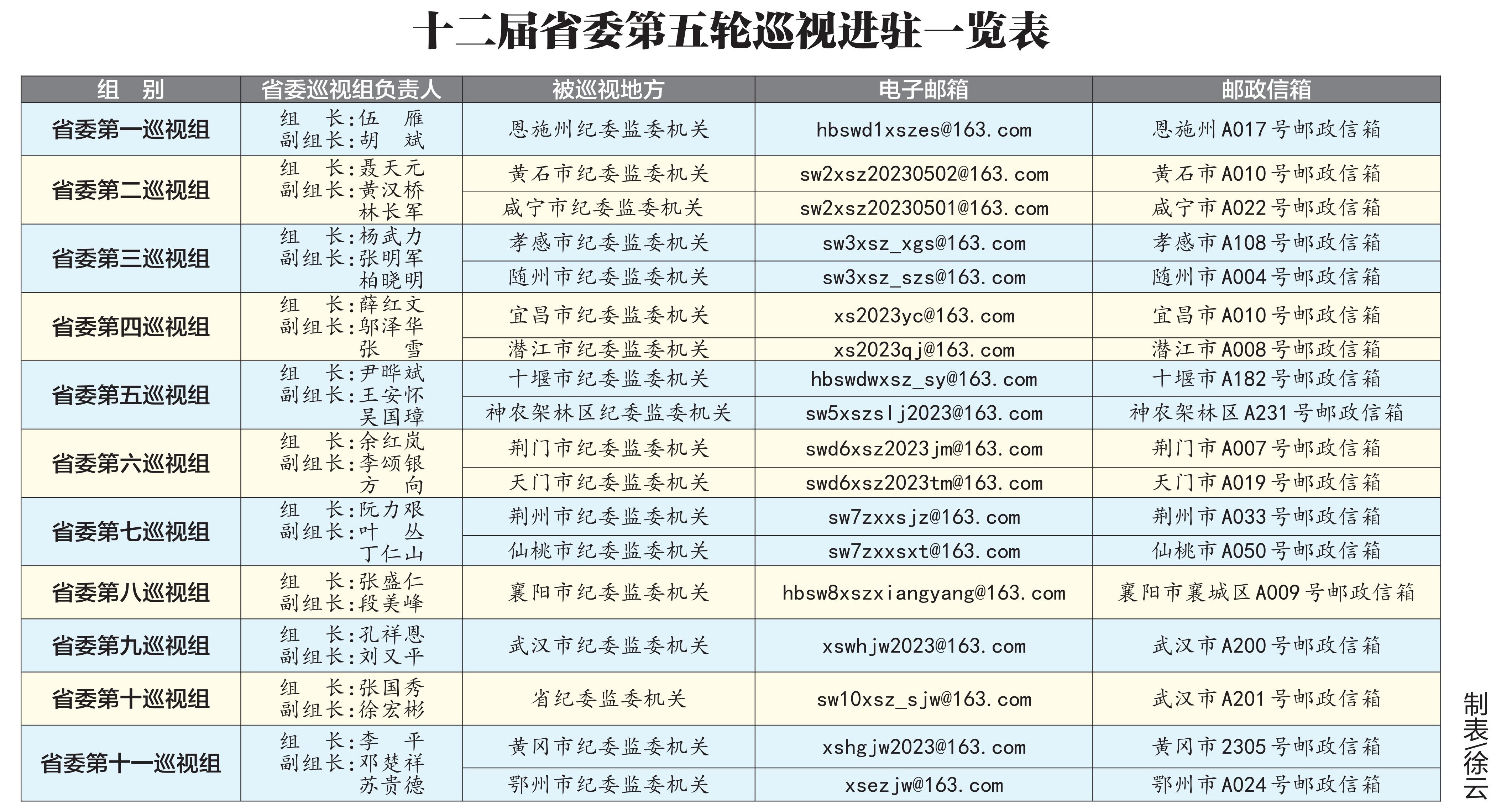 根据省委统一部署,本轮巡视将对省纪委监委机关,武汉市、襄阳市、宜昌市、黄石市、十堰市、荆州市、荆门市、鄂州市、孝感市、黄冈市、咸宁市、随州市、恩施州,仙桃市、天门市、潜江市,神农架林区纪委监委机关共18个单位开展专项巡视。工作时间1个月左右,巡视期间设立邮政信箱、电子邮箱和“荆楚码上巡”信访反映二维码,主要受理反映被巡视纪委监委领导班子及成员、下一级纪委监委主要负责人和纪检监察干部问题的来信。巡视组受理信访时间11月17日截止。(杨宏斌、刘宇航)