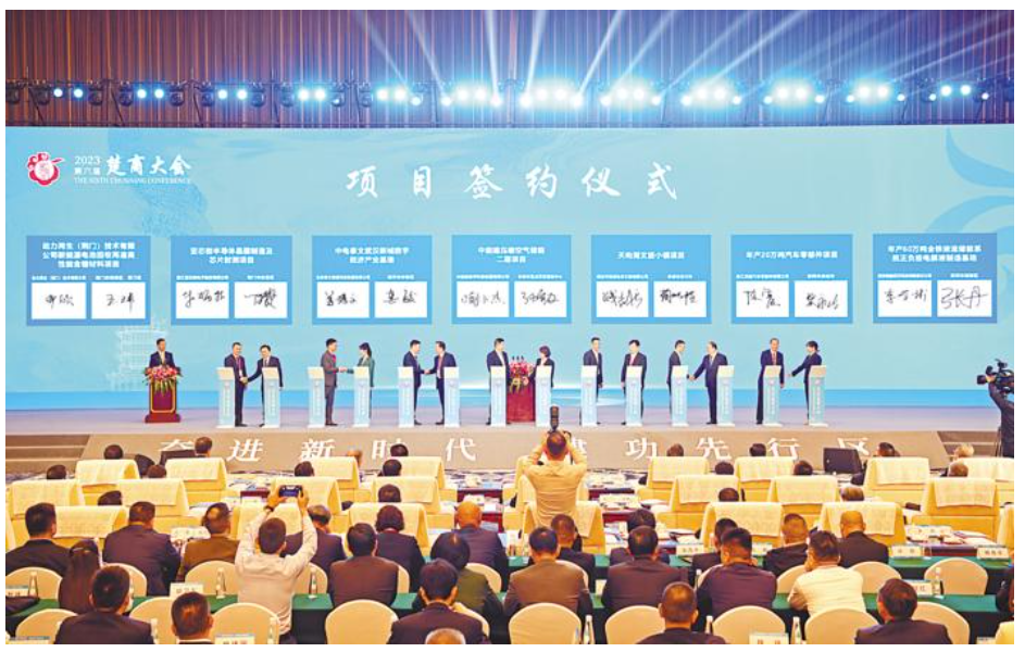 11月8日,在第六届楚商大会开幕式上,一批高质量项目现场签约。这些项目聚焦湖北五大突破性发展优势产业和九大新兴特色产业领域,涵盖先进制造、光电子信息、生命健康、新材料、文化旅游、现代商贸等行业领域。其中,武汉市签约总额达238亿元,天门市、荆州市、黄石市签约总额均超过120亿元,襄阳市聚焦新能源与智能网联汽车产业,落户一批优质项目。