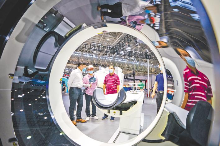 世界大健康博览会联影医疗展区,CT机系列产品和智慧手术室,和飞利浦、GE等国际巨头同台比拼。(魏铼 摄)