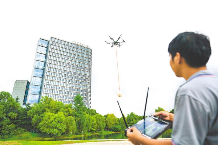 光谷未来科技城,一架电鹰大载重智能无人机搭载运输载荷进行测试。(魏铼 摄)