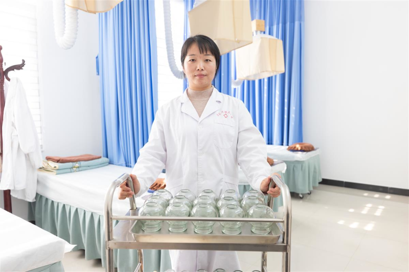 11月5日,四邑村医养服务驿站,中医技师谭娟在整理拔罐器械。(柯皓 摄)