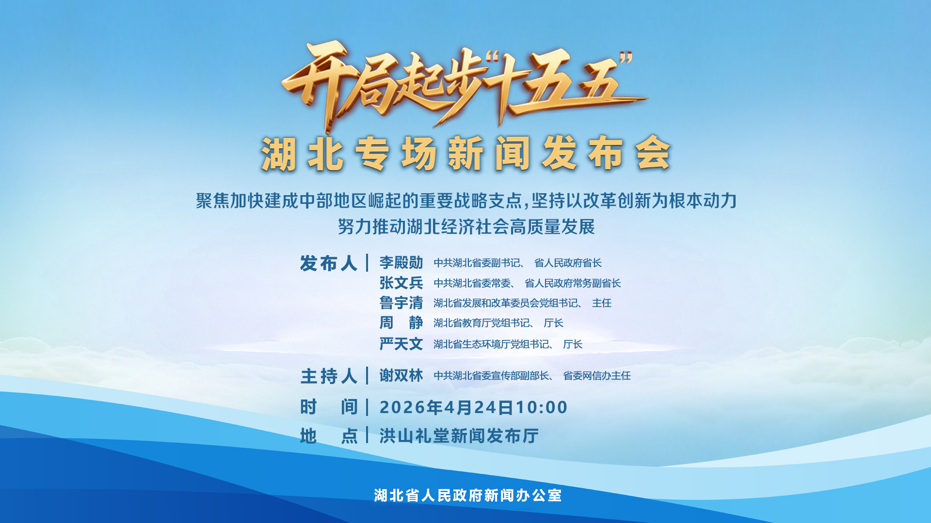 湖北省人民政府新闻办公室将于4月24日(星期五)上午10:00在洪山礼堂新闻发布厅举行开局起步“十五五”湖北专场新闻发布会,邀请中共湖北省委副书记、省人民政府省长李殿勋,中共湖北省委常委、省人民政府常务副省长张文兵,湖北省发展和改革委员会党组书记、主任鲁宇清,湖北省教育厅党组书记、厅长周静,湖北省生态环境厅党组书记、厅长严天文围绕《湖北省国民经济和社会发展第十五个五年规划纲要》,全面介绍湖北聚焦加快建成中部地区崛起的重要战略支点,坚持以改革创新为根本动力,努力推动湖北经济社会高质量发展的相关情况,并答记者问。