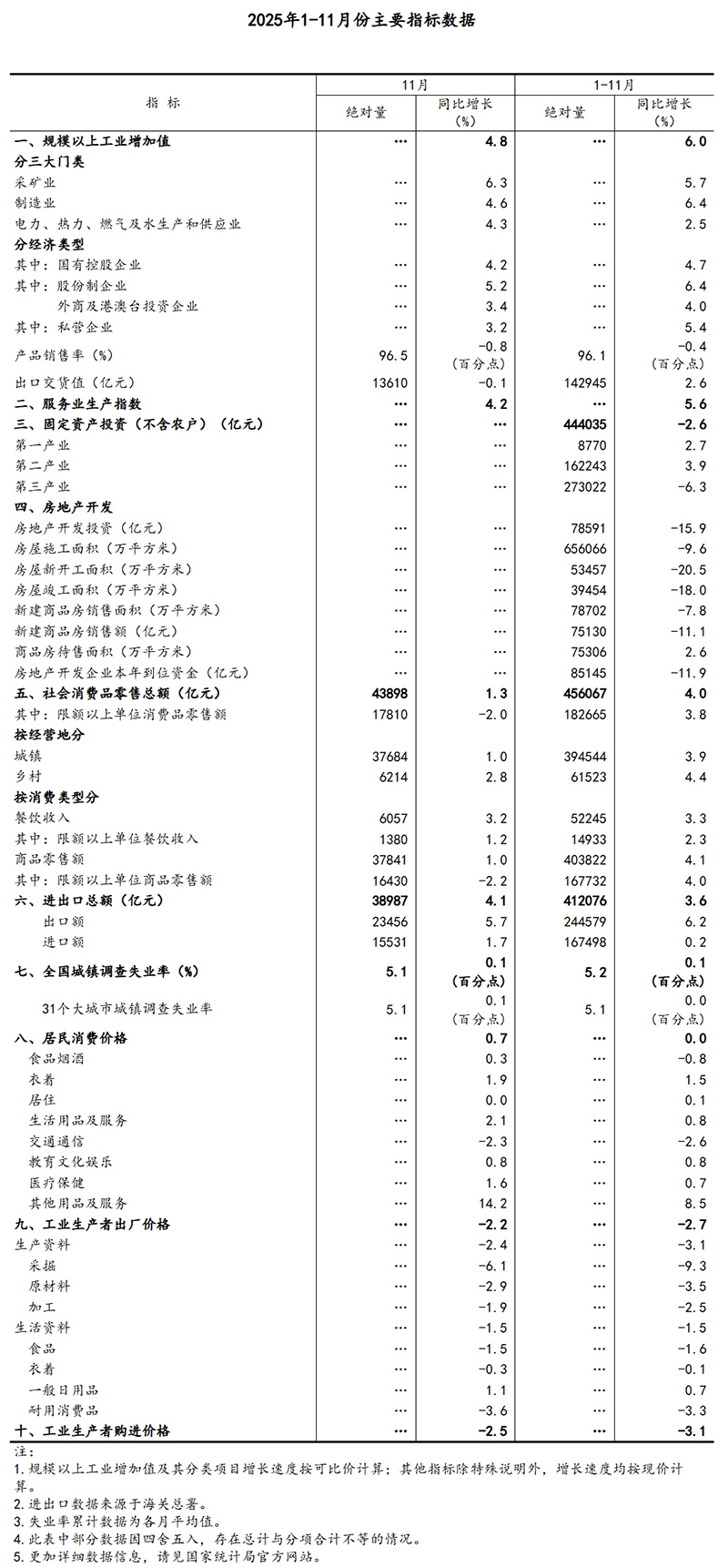 总的来看,11月份国民经济运行总体平稳,延续稳中有进发展态势。但外部不稳定不确定因素较多,国内有效需求不足,经济运行面临不少挑战。下阶段,要坚持以习近平新时代中国特色社会主义思想为指导,深入贯彻落实党的二十大和二十届历次全会、中央经济工作会议精神,坚持稳中求进工作总基调,实施更加积极有为的宏观政策,持续扩大内需、优化供给,做优增量、盘活存量,着力稳就业、稳企业、稳市场、稳预期,推动经济实现质的有效提升和量的合理增长。