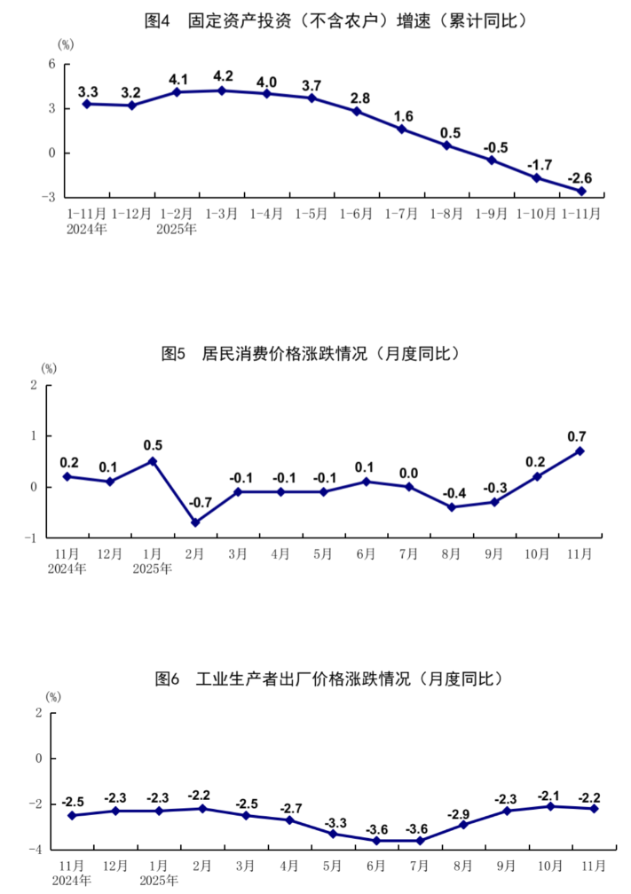 11月份,全国规模以上工业增加值同比增长4.8%,环比增长0.44%。分三大门类看,采矿业增加值同比增长6.3%,制造业增长4.6%,电力、热力、燃气及水生产和供应业增长4.3%。装备制造业增加值同比增长7.7%,高技术制造业增加值增长8.4%,分别快于全部规模以上工业增加值2.9和3.6个百分点。分经济类型看,国有控股企业增加值同比增长4.2%;股份制企业增长5.2%,外商及港澳台投资企业增长3.4%;私营企业增长3.2%。分产品看,3D打印设备、工业机器人、新能源汽车产品产量同比分别增长100.5%、20.6%、17.0%。1-11月份,全国规模以上工业增加值同比增长6.0%。11月份,制造业采购经理指数为49.2%,比上月上升0.2个百分点;企业生产经营活动预期指数为53.1%,上升0.3个百分点。1-10月份,全国规模以上工业企业实现利润总额59503亿元,同比增长1.9%。