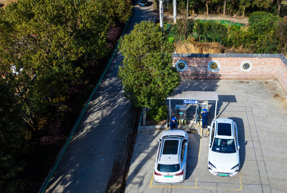 2026年1月11日,国网鄂州供电公司工作人员对鄂州市鄂城区西山街道小桥村充电站的充电设备进行巡检(无人机照片)。肖艺九 摄